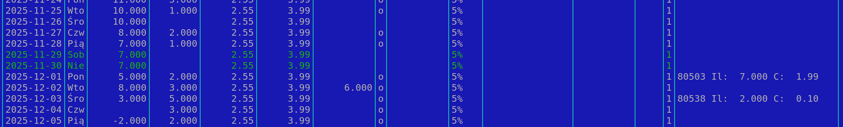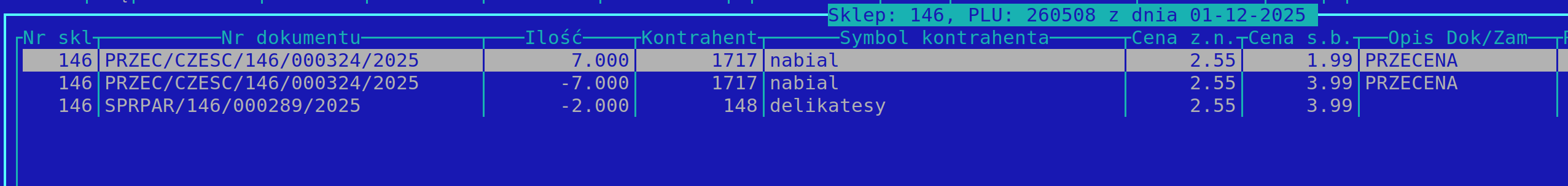 Dodatkowo możemy podejrzeć w historii towaru jakimi dokumentami robiliśmy przeceny, wystarczy ustawić się na danym dniu np 2025-12-01 i wybrać "d" (jak dokument).
