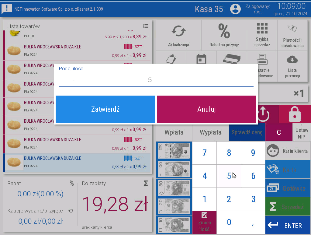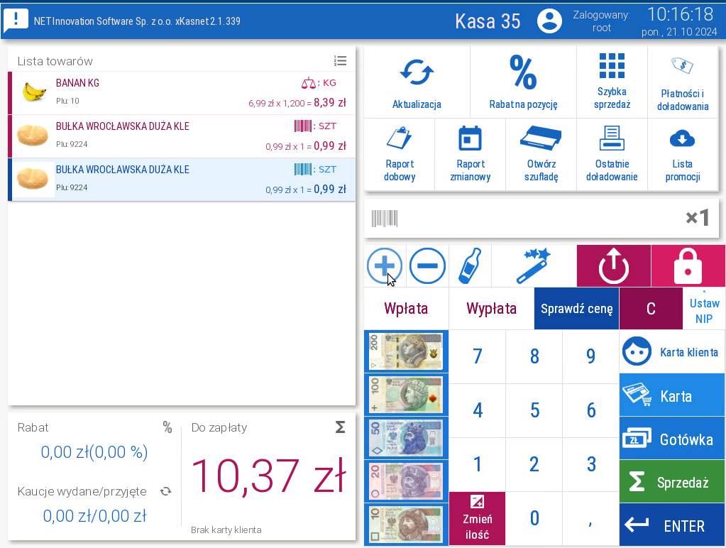 Kolejnym ułatwieniem, a zarazem zmianą jest dodawanie ilości, to znaczy przed zeskanowaniem produktu i jego kodu paskowego można na klawiaturze dotykowej wcisnąć 3 następnie kafelek z X i zeskanować nasz kod paskowy. W tym momencie towar pojawia się w odpowiedniej ilości na naszym paragonie.