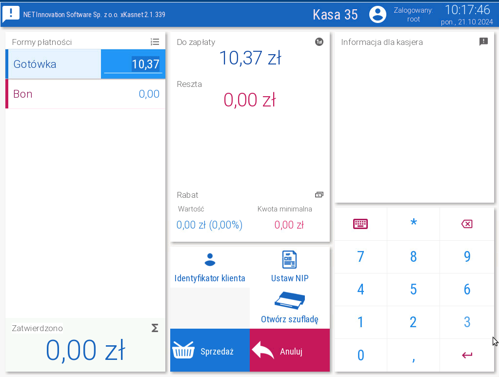 Przed przystąpieniem do sprzedaży, należy upewnić się, że jest zerowy stan kasy. W zależności od konfiguracji, po zalogowaniu się kasjera, program sprawdza stan kasy i jeśli jest niezerowa informuje o tym.