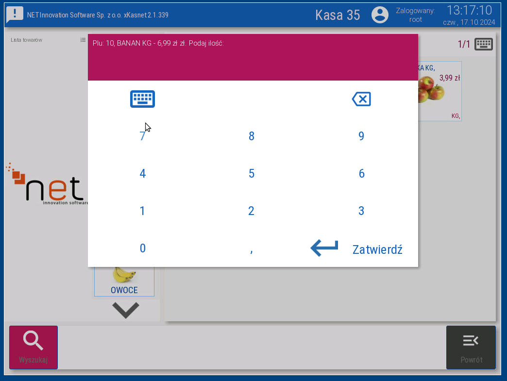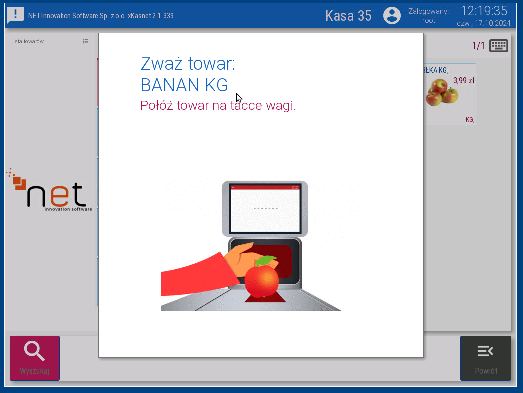 Dodając towar luzowy, należy najpierw wybrać towar a następnie zważyć go na wadze.