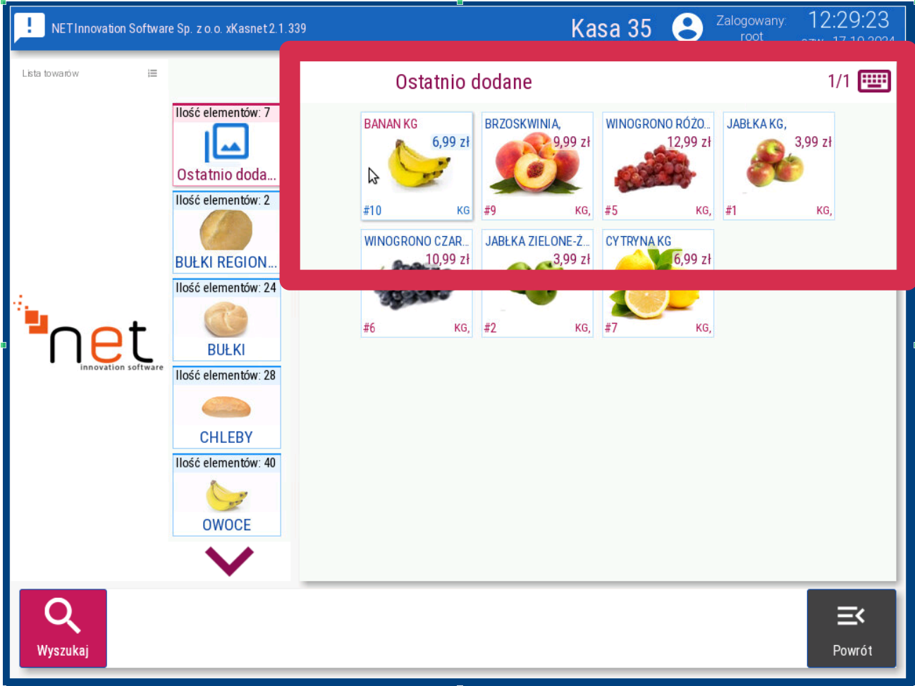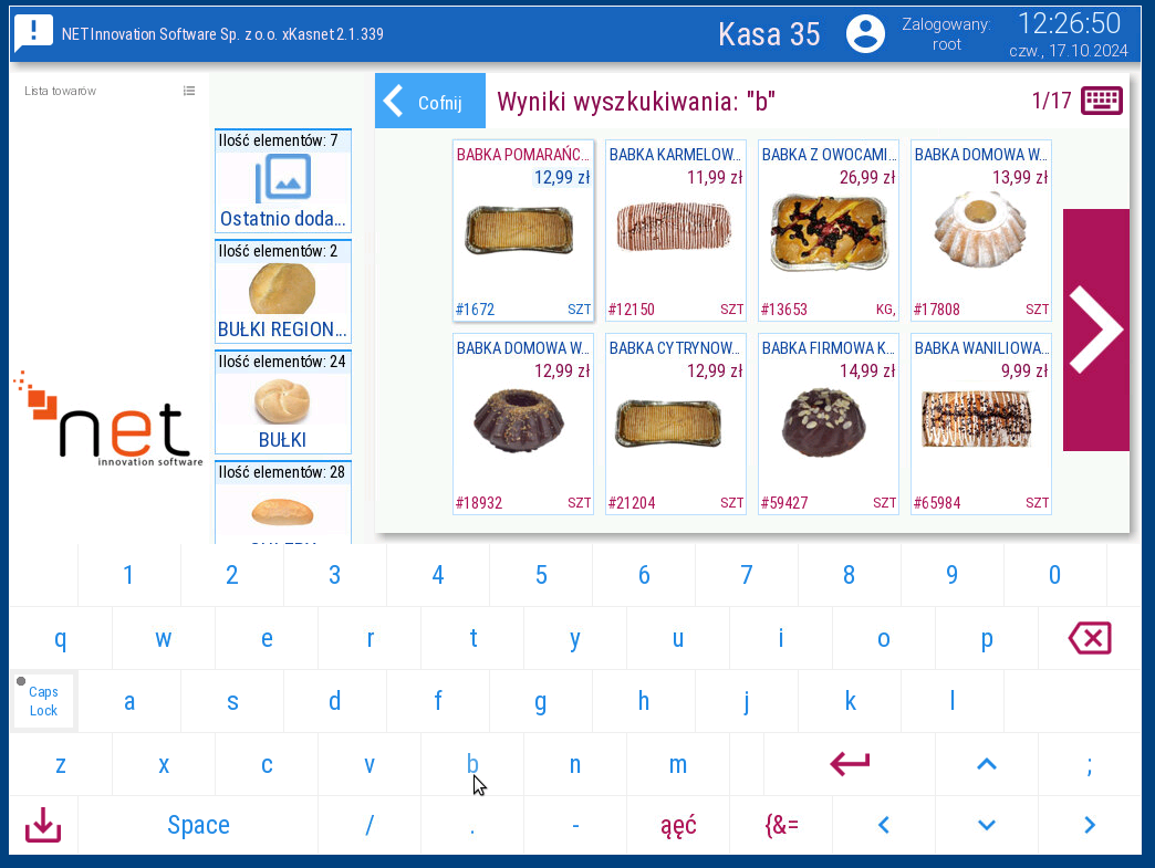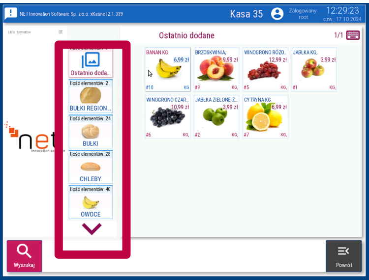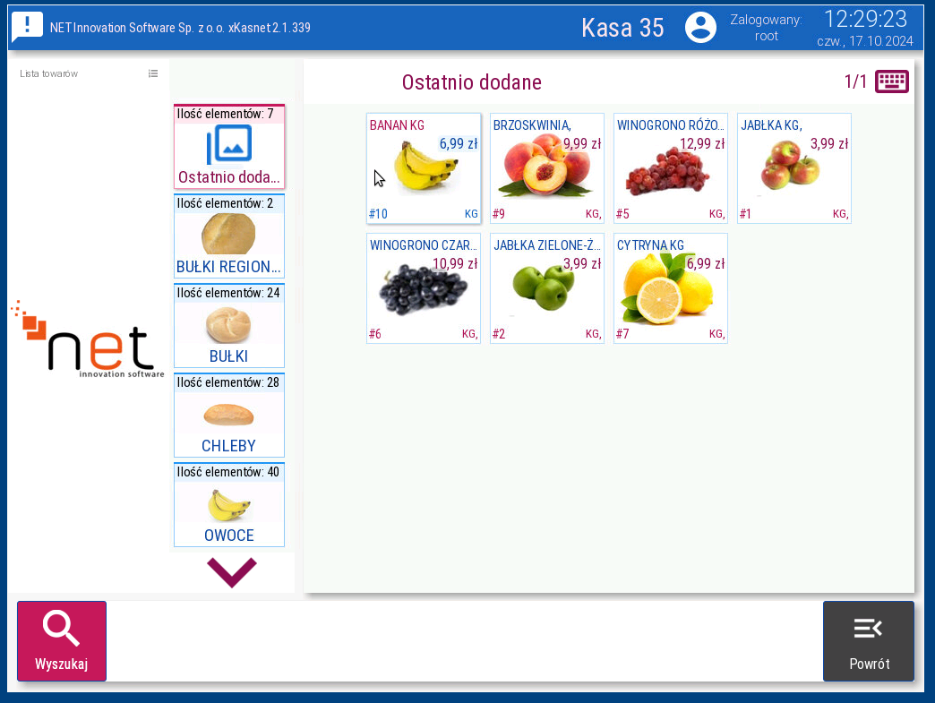 Po lewej stronie mamy widok kategorii (owoce, warzywa, pieczywo, doładowania, cukierki itp.). Kafelki dostosowują się do wielkości na ekranie w zależności od jej ilości. W konfiguracji możemy ustalić minimalną oraz maksymalną ilość towarów w danej grupie asortymentowej. Po prawej stronie klikając na klawiaturę możemy wyszukiwać produkty w szybkiej sprzedaży, gdzie na klawiaturze wpisujemy interesujący nas towar. Klikając na towar dodajemy go do paragonu. W wersji premium mamy również możliwość dodawania zdjęć do towarów, które nie są objęte szybką sprzedażą np. majonez, jogurt, cola itp. Zdjęcia wprowadzane są na podobnej zasadzie jak do szybkiej sprzedaży. Zalecane formaty plików graficznych do wgrania to jpg, png.