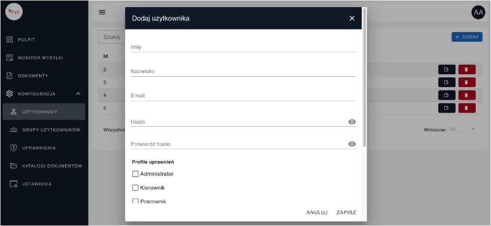 • dodaje użytkowników (moduł Użytkownicy → + Dodaj)