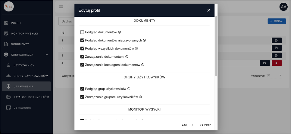 • określonych typów dokumentów (moduł Uprawnienia → +Dodaj lub Edytuj)