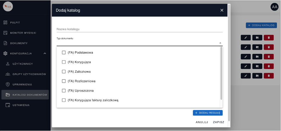 • możliwość definiowania typów dokumentów w obrębie katalogów (moduł Konfiguracja → Katalogi Dokumentów → +Dodaj Katalog lub Edytuj lub Dodaj Podkatalog)
